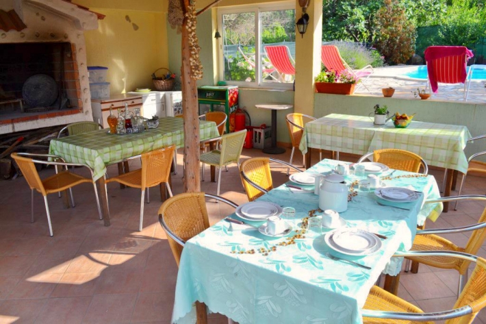 Gemeinsame überdachte Hoffterasse mit Grill beim Swimmingpool.