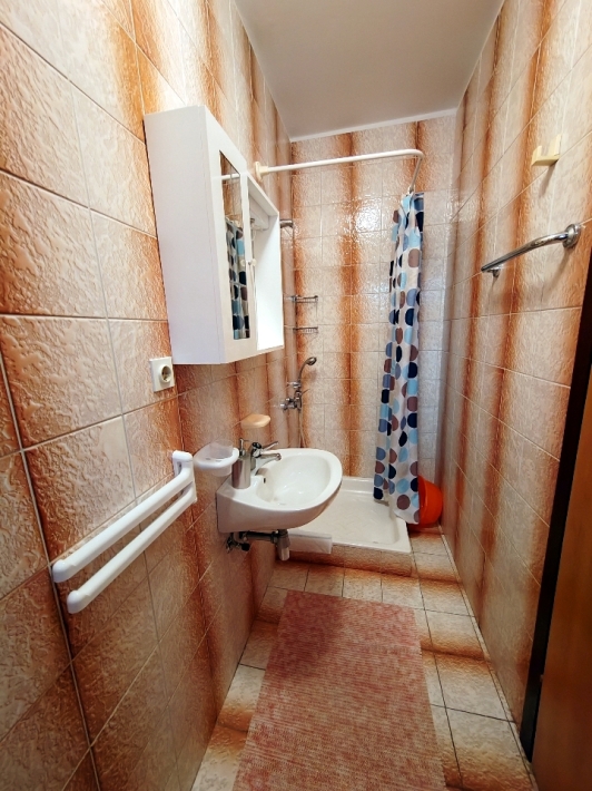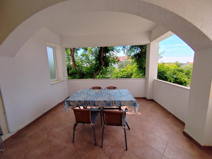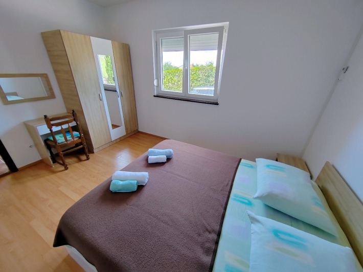 Description German: Dieses Apartment für 4-5 Personen liegt in Barbat auf der beliebten Urlaubsinsel Rab, nur 280 m vom Meer entfernt. Die 60 m² große Wohnung befindet sich im Erdgeschoss des Hauses und teilt sich in zwei Schlafzimmer, zwei Badezimmer und einen Ess- und Wohnbereich mit Küche auf. Eine Schlafcouch im Wohnbereich bietet Platz für 1 Person. Die Unterkunft ist mit WLAN-Internet, Sat-TV, 3 Klimaanlagen (1x pro Schlafzimmer + 1x im Wohnraum) ausgestattet. Die schöne, große, überdachte mit Stühlen und Tisch möblierte Terrasse bietet Ihnen eine Platz um Genießen . Im Außenbereich des Hauses steht Ihnen noch eine Terrasse mit Grill zur Verfügung. Restaurants, Supermarkt und herrliche Bademöglichkeiten erreichen Sie bequem zu Fuß innerhalb weniger Minuten. Bis in das Zentrum der Stadt Rab sind es etwa 4,5 km.