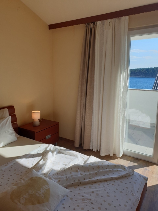 Description German: Genießen Sie einen traumhaften Ausblick auf das Meer und die vorgelagerte Insel Dolin. Der hübsche Strand des Hotels Barbat und der benachbarte Strand Grci sind innerhalb weniger Gehminuten erreichbar. Auf 35 m² im 1. Obergeschoss des Hauses bietet Ihnen dieses Apartment für 2-3 Personen ein Schlafzimmer, ein Wohn/Esszimmer mit Küche und ein Badezimmer. Die Unterkunft ist mit Sat-TV, Klimaanlage und Geschirrspülmaschine ausgestattet. Im Außenbereich lädt der rund 6 m² große, möblierte Balkon der FeWo zum Verweilen ein. Grillmöglichkeit und Parkplatz bei Haus sind ebenfalls vorhanden. Bootsliegeplatz kann auf Wunsch mit dazugebucht werden.